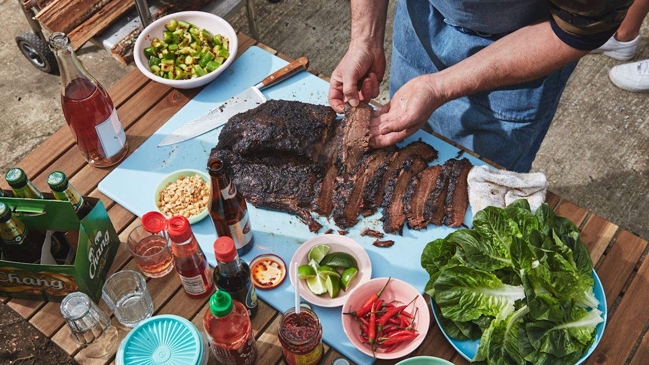 Brisket is a full-flavoured secondary cut that becomes so tender after slow-cooking. For this recipe, we use bold, spicy flavours that play beautifully with pull-apart meat – they’re layered into the marinade then built up further with condiments and sides.
