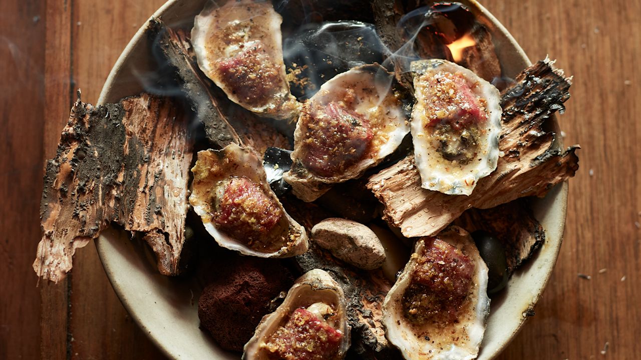 This is an elegant spin on surf-and-turf, taking advantage of the briny minerality of the oyster and the deep umami of the wagyu. They’re brought together physically, by wrapping the oyster in a thin strip of wagyu, and in a dressing that uses rendered wagyu fat instead of oil, with extra texture from a mushroom and beef crumb.