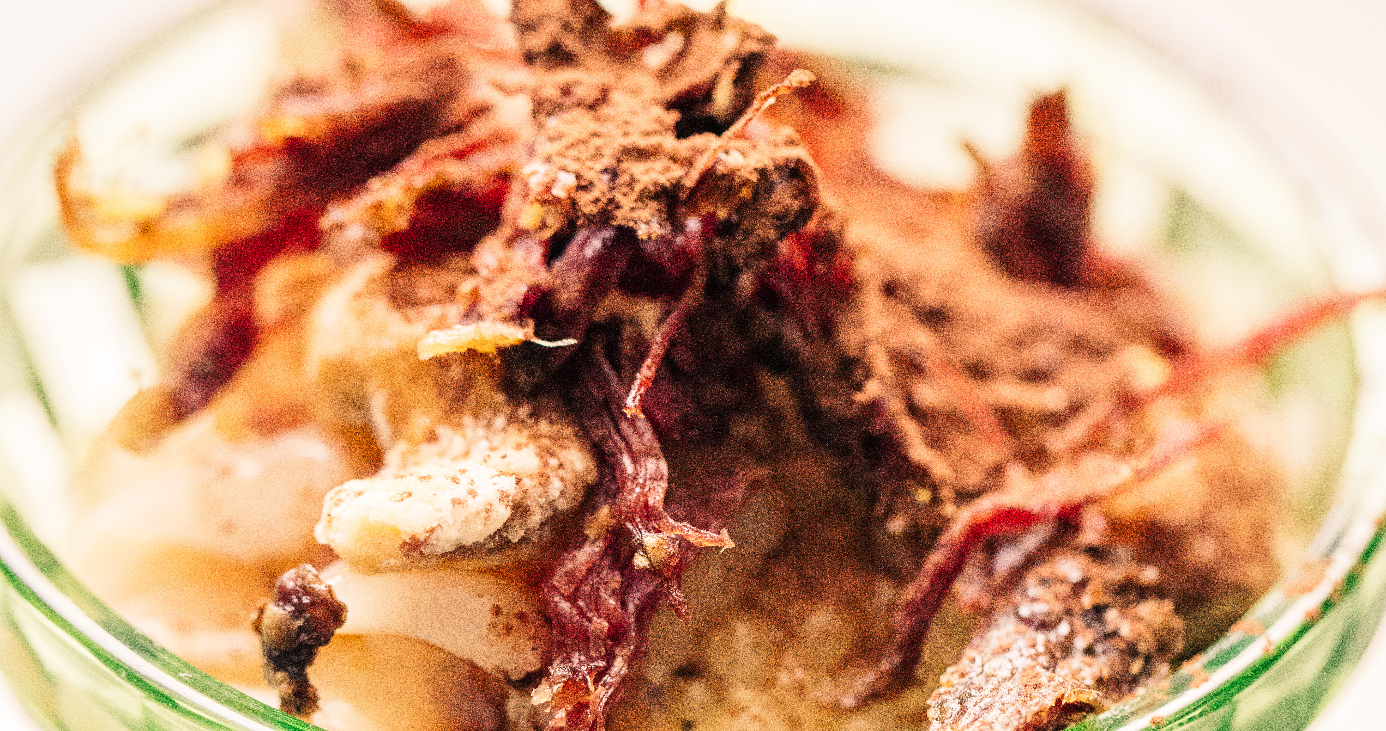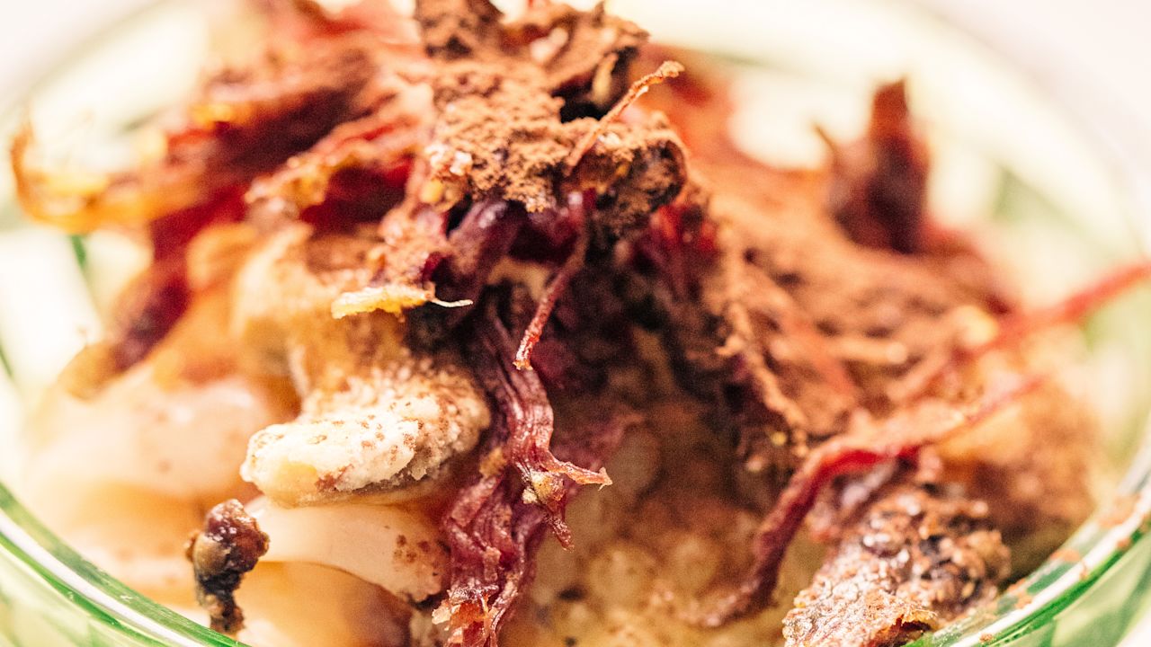 Flake over Cured Wagyu Cheek and dust with cocoa powder.