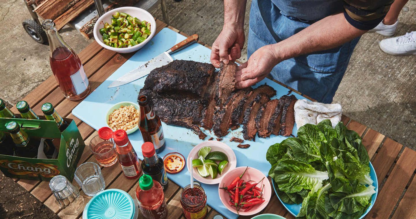 Brisket is a full-flavoured secondary cut that becomes so tender after slow-cooking. For this recipe, we use bold, spicy flavours that play beautifully with pull-apart meat – they’re layered into the marinade then built up further with condiments and sides.