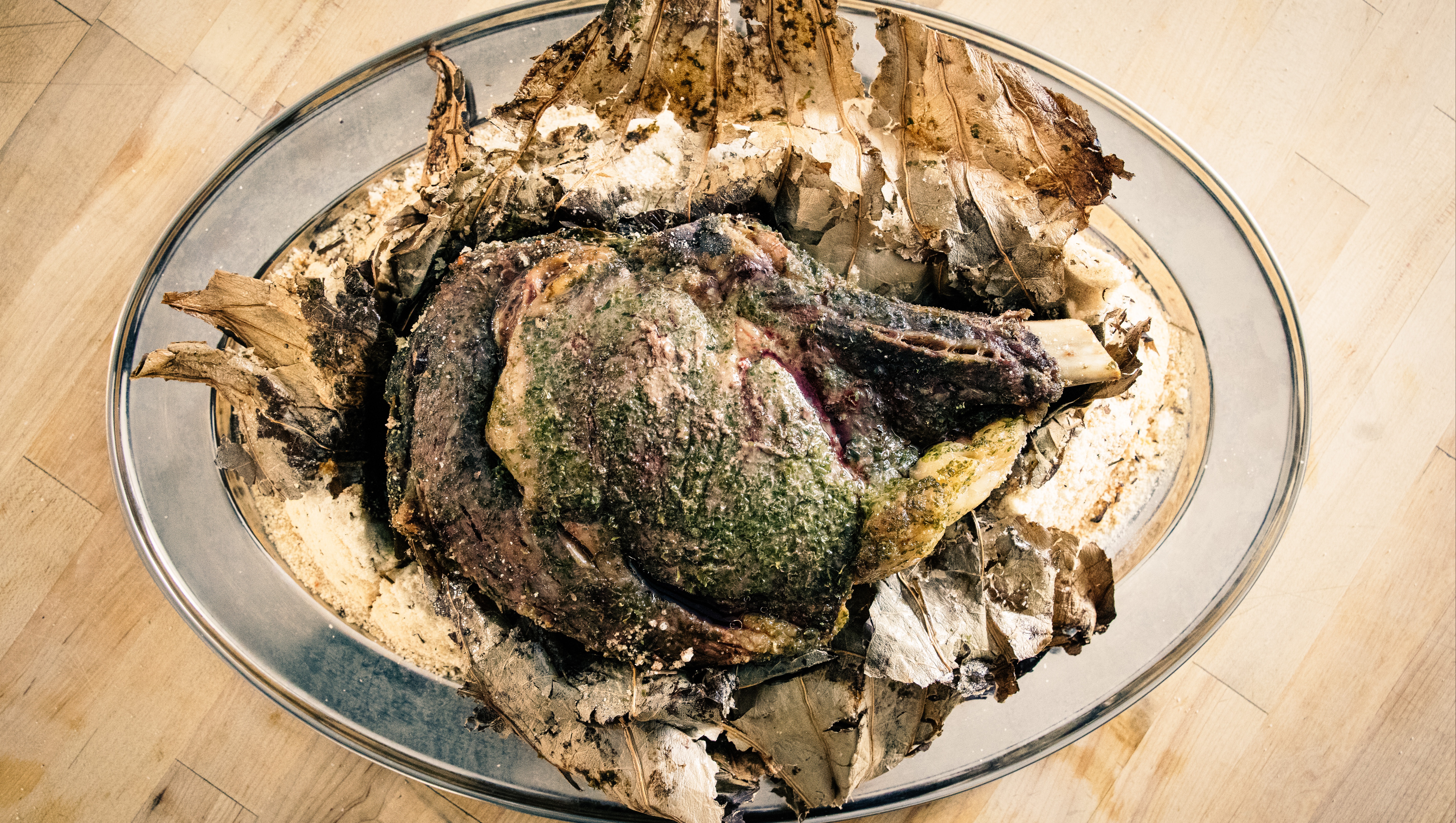 A salt crust performs the same function as clay: slowing down the cooking, sealing in moisture and gently imparting salinity and flavour, almost like an infusion. “The juices have nowhere to go,” says Brandon. “The dish keeps basting itself.”