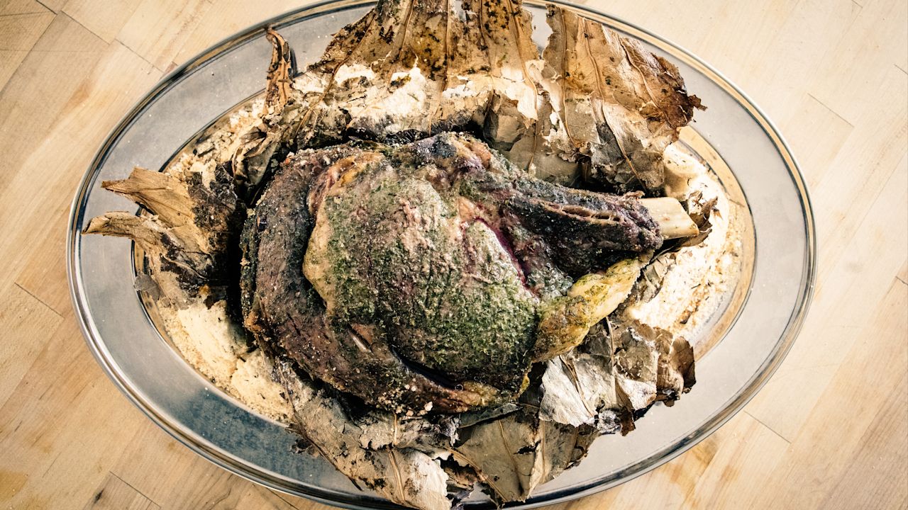 This spectacular roast ribeye is a spin on beggar’s chicken, a classic Chinese dish that was traditionally wrapped in lotus leaves and baked in clay. “The story goes that a beggar stole a chicken and hid it by burying it underground,” says chef Brandon Jew from San Francisco’s Mr Jiu’s. “When he came back it was a juicy, juicy chicken.”