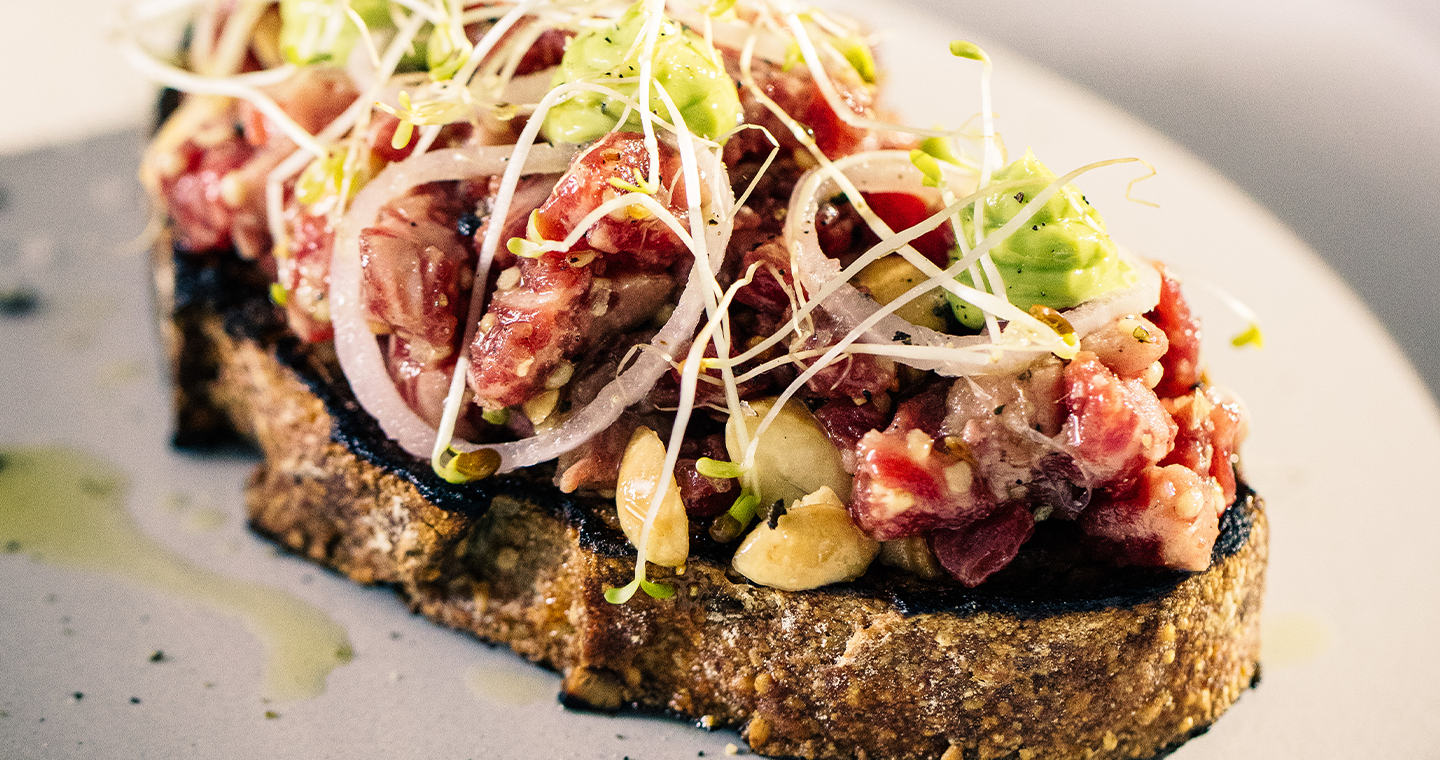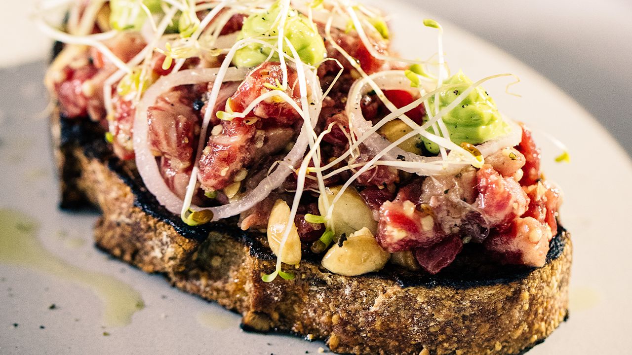 To serve, spread the tartare on the grilled bread and dot with Hayaioli and pickled shallots and then top with alfalfa sprouts. Finish with a grind of black pepper and some sea salt.