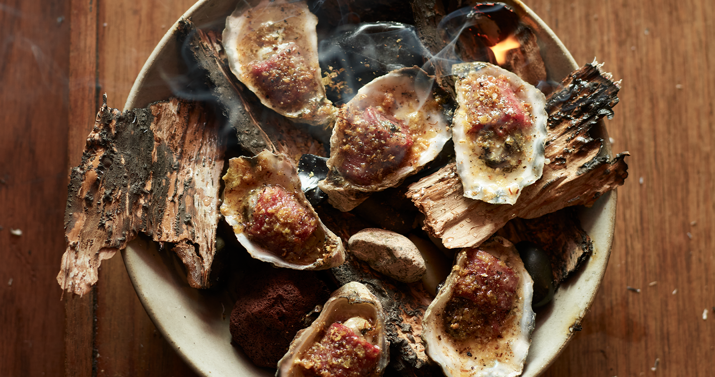 This is an elegant spin on surf-and-turf, taking advantage of the briny minerality of the oyster and the deep umami of the wagyu. They’re brought together physically, by wrapping the oyster in a thin strip of wagyu, and in a dressing that uses rendered wagyu fat instead of oil, with extra texture from a mushroom and beef crumb.